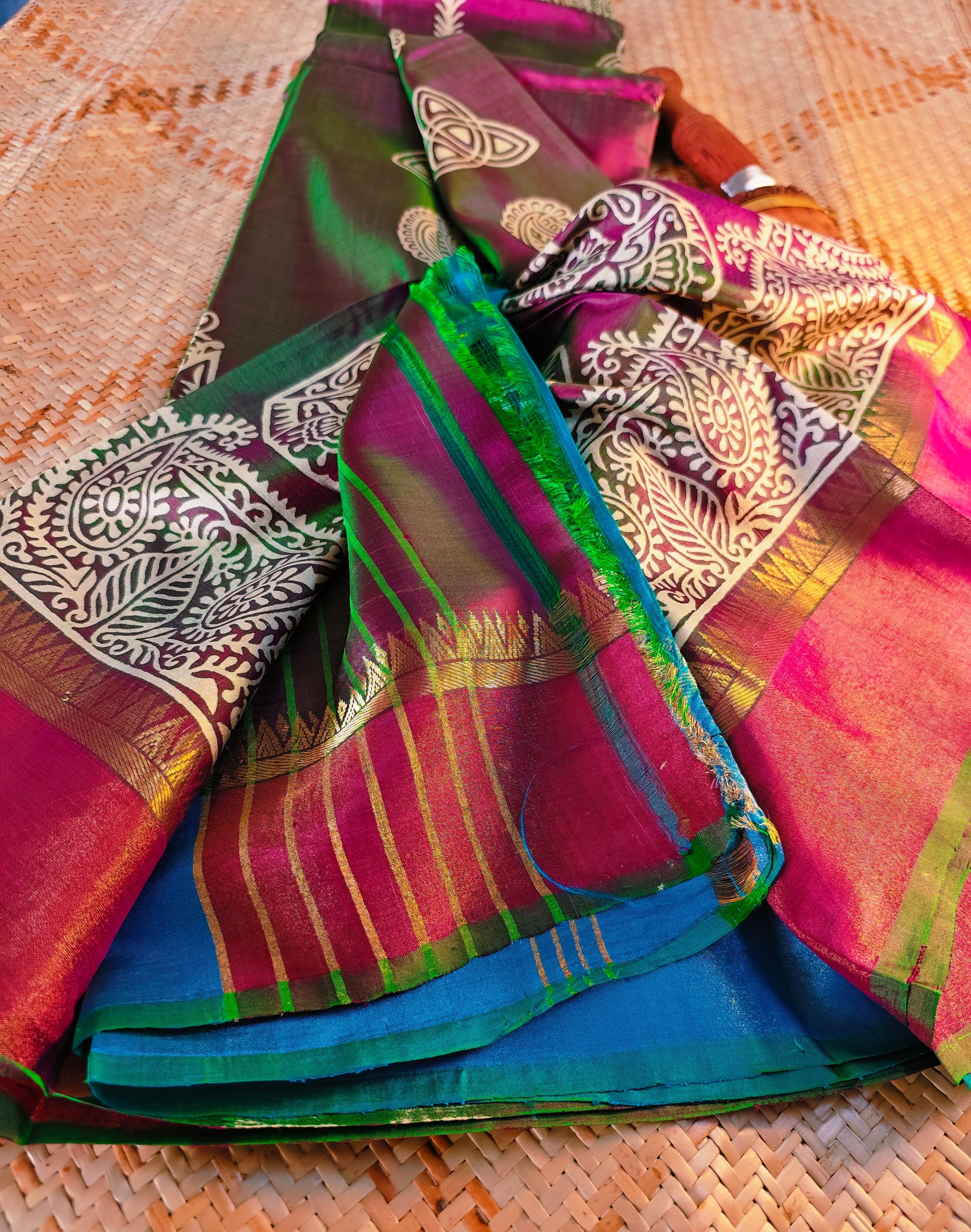 Colour: Dual tone pink and shades green of blue colour pallu with Golden tone border