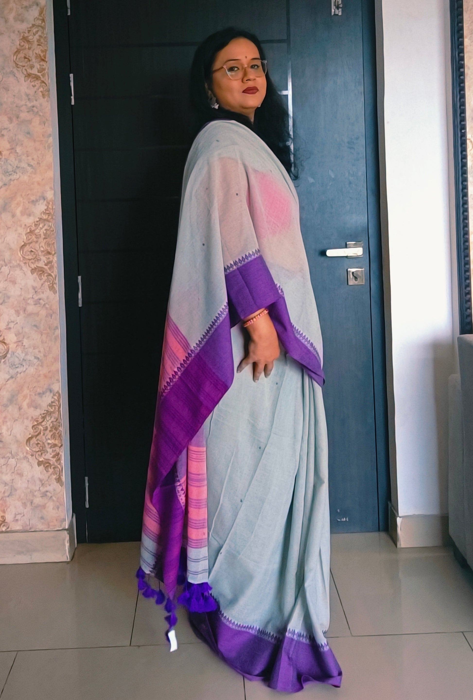 Colour: light grey with purple border and pink stripes on pallu