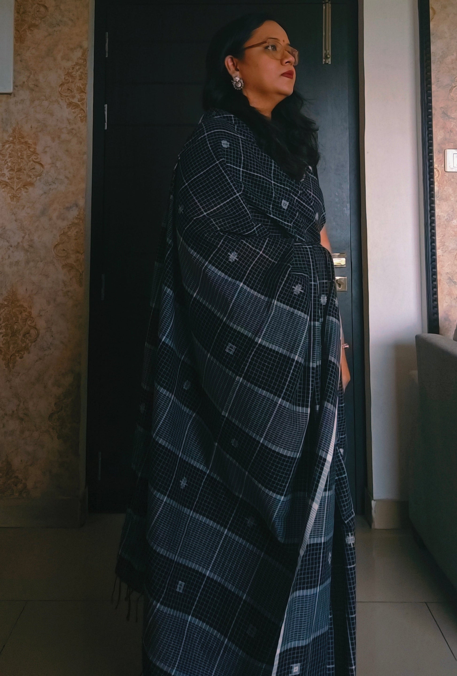This timeless handwoven saree merges deep earthy black tones with soft ivory grids and slate grey stripes, staying true to its ode to grounded elegance. The subtle thread buti motifs scattered across the body add simplicity with substance. Delicate hand-twisted tassels and a contrasting border bring a quiet charm to this classic weave.
